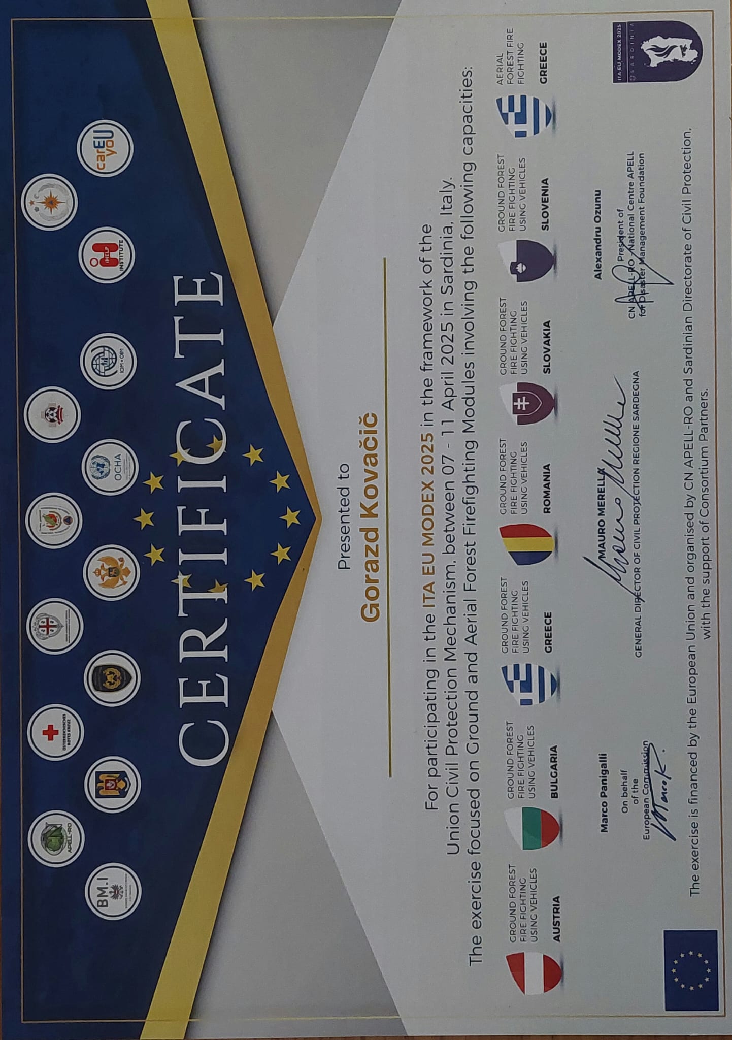 Naš član, Gorazd Kovačičl, se je v aprilu odpravil na izobraževanje na GFFF-V modul na Sardinijo. Gre za mednarodno vajo Euromodex, ki je potekala od 7. 4. do 12. 4. Na vaji so sodelovale tudi druge države. Tako so bile tam prisotne tudi Avstrjia, Romunija, Bolgarija, Slovaška, Grčija in seveda Slovenija. Sama vaja je bila tudi upoštevana za pridobitev certifikata, ki sedaj omogoča, da se lahko udeleženci vaje odzovejo na pomoč prek sistema EU.